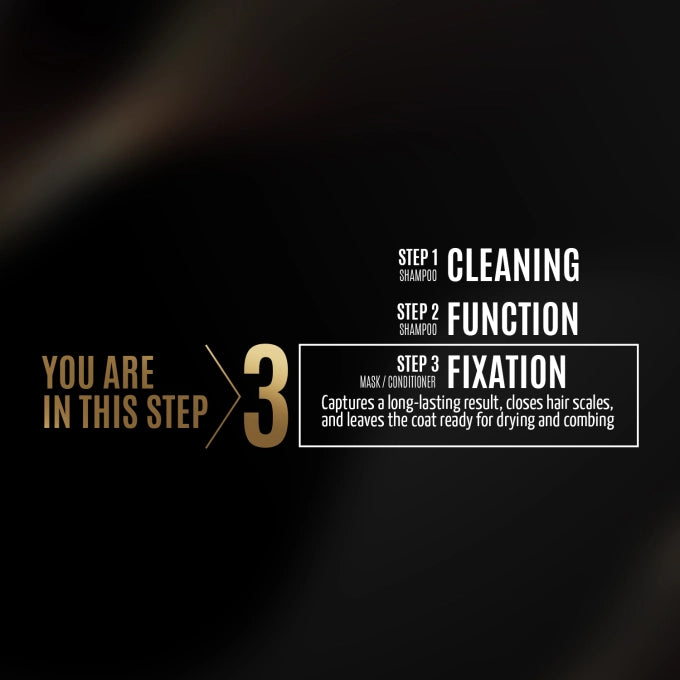 Þetta krem er þriðja skrefið – fasta – í þriggja skrefa kerfi: feldurinn er meðhöndlaður, niðurstaðan er fest og rakaástandið í feldinum er viðhaldið.